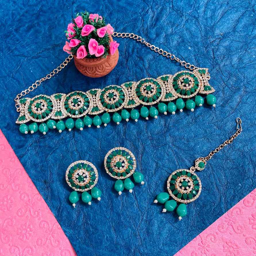 Product Details: 1 Necklace::1 Pair of Earring::1 Maang Tikka