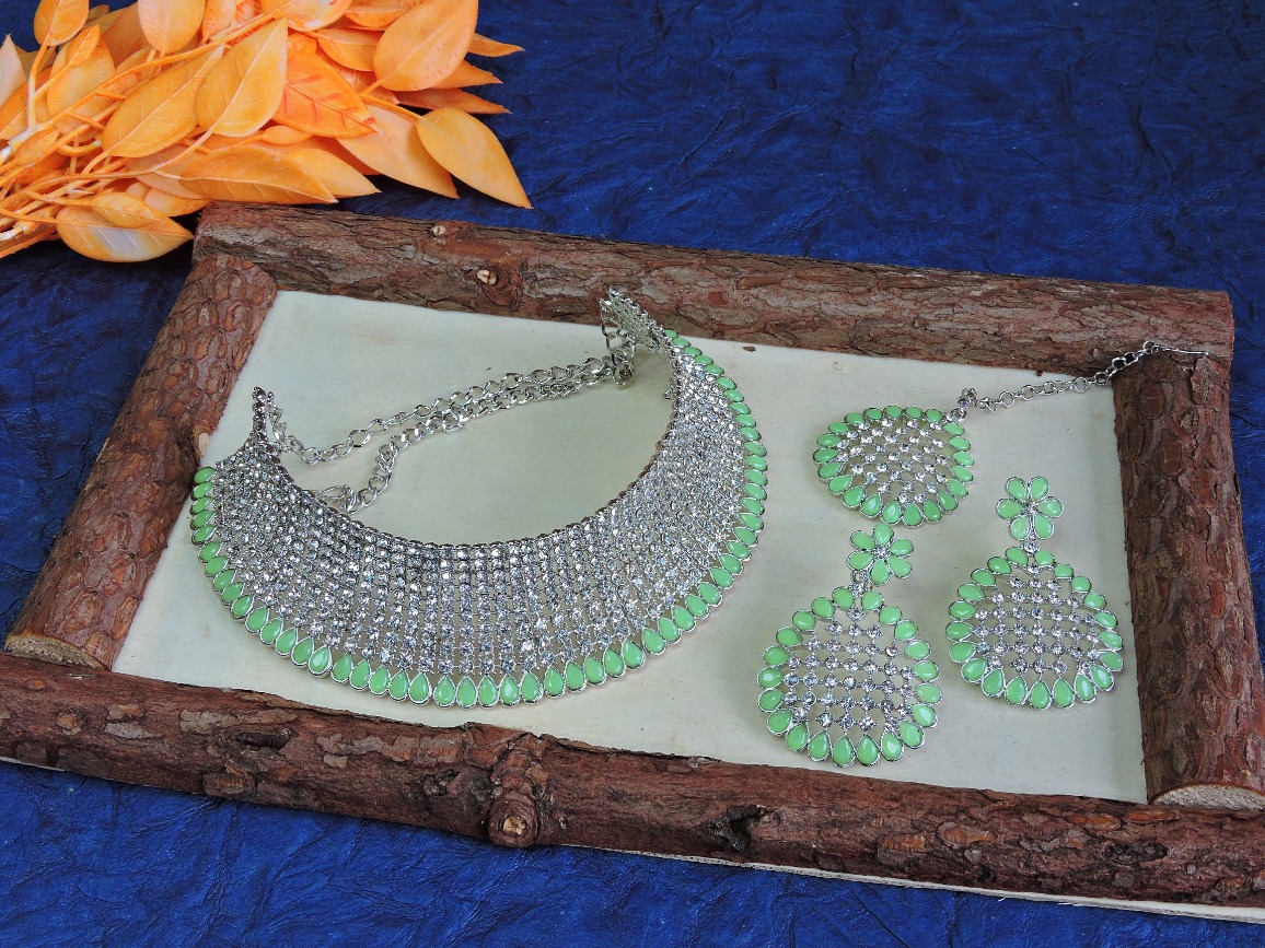 Product Details: 1 Necklace::1 Pair of Earring::1 Maang Tikka