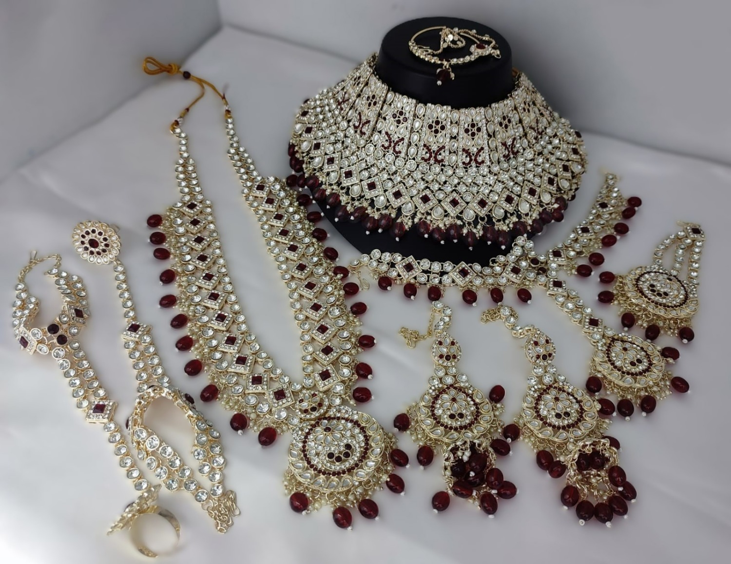 Details1 Choker Necklace, 1 Long Necklace, 1 Pair Earrings, 1 Nose Ring, 1 Mang Patti With Mang Tikka, 1 Passa, 1 Pair Of Hathpaan