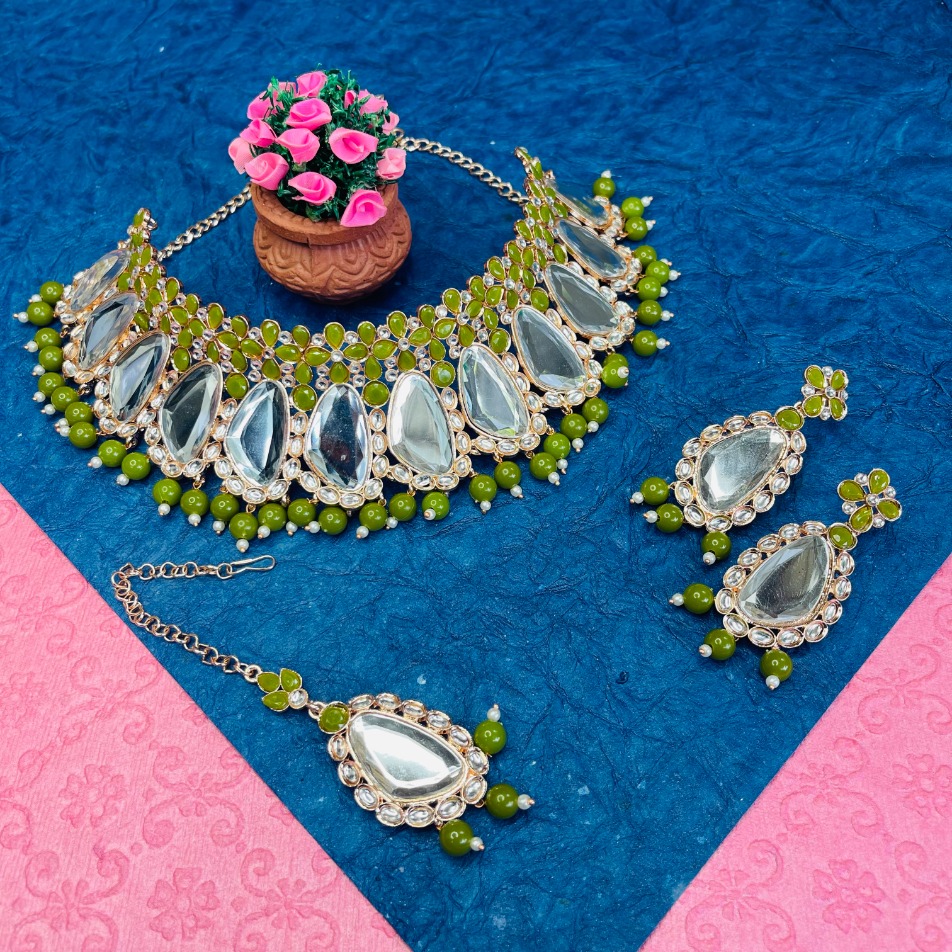 Product Details: 1 Necklace::1 Pair of Earring::1 Maang Tikka