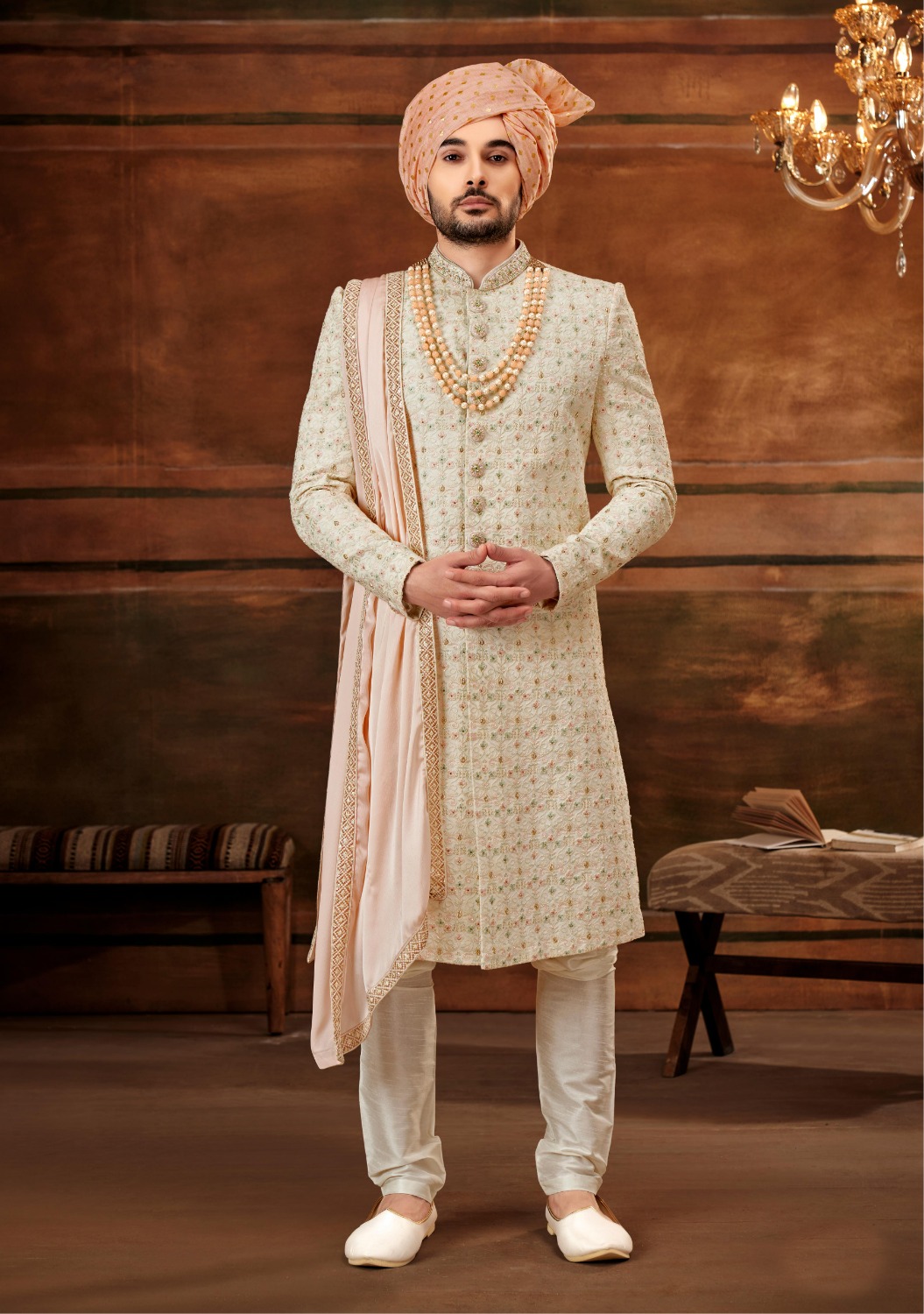 Picture of Delightful Georgette Cream Wedding Sherwani