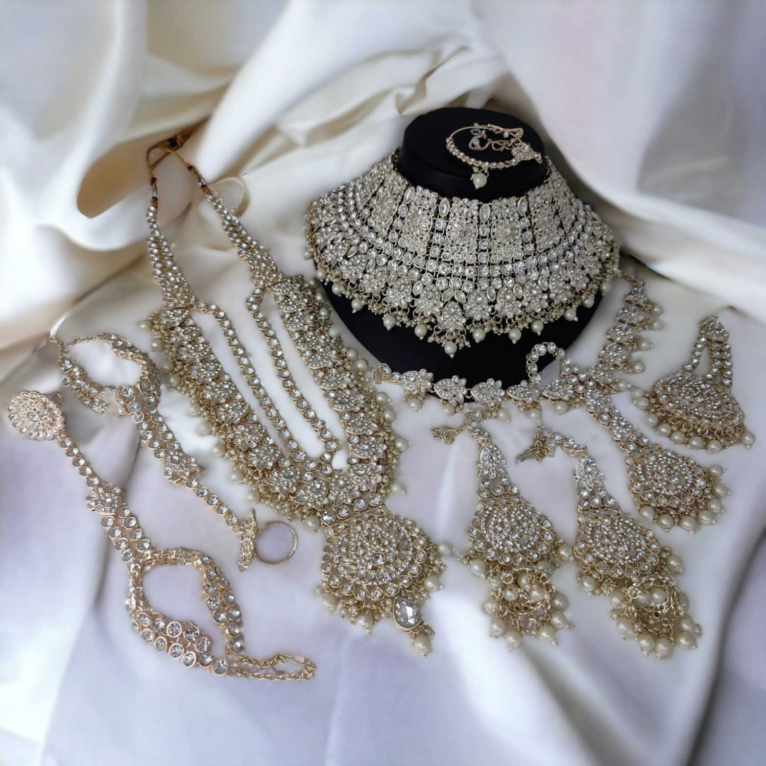 Details1 Choker Necklace, 1 Long Necklace, 1 Pair Earrings, 1 Nose Ring, 1 Mang Patti With Mang Tikka, 1 Passa, 1 Pair Of Hathpaan