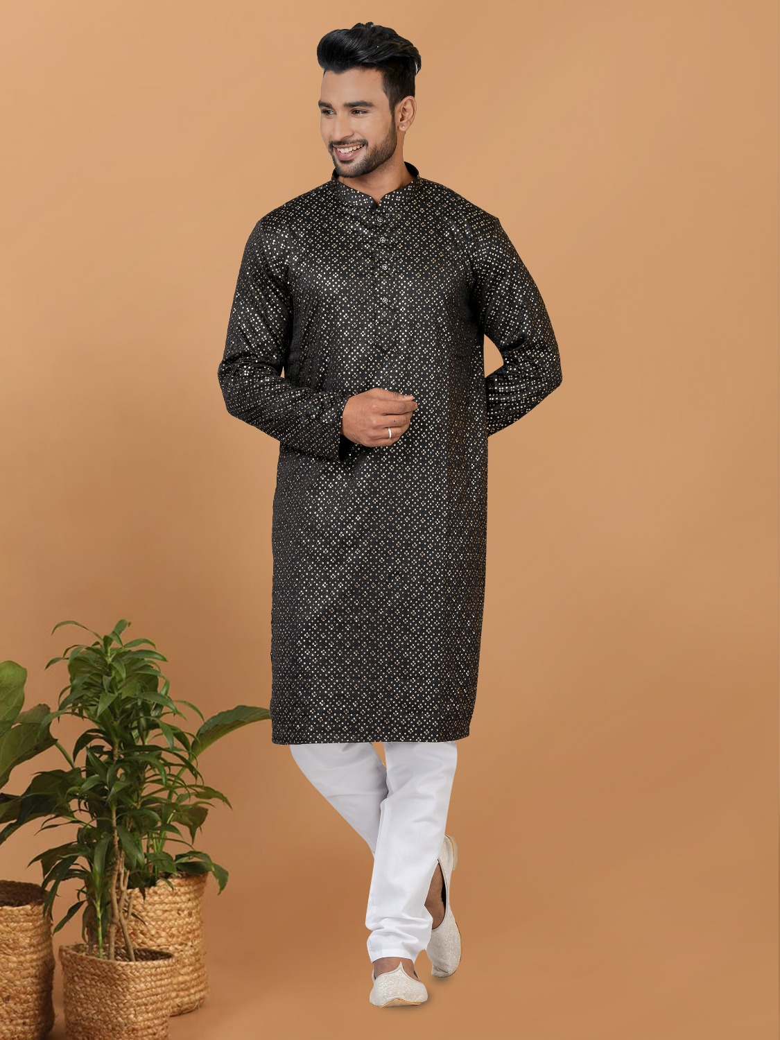 Excellent Semi Gaji Silk Black Kurta Pajama