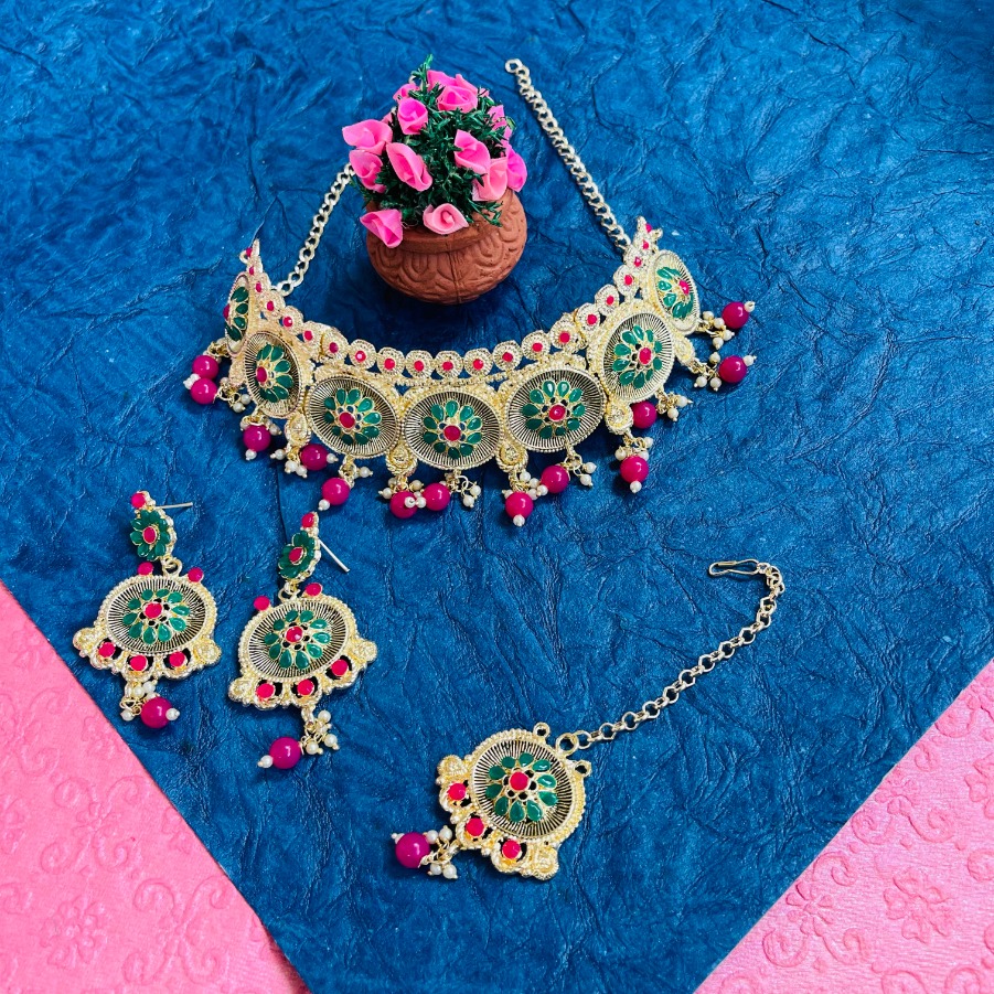 Product Details: 1 Necklace::1 Pair of Earring::1 Maang Tikka
