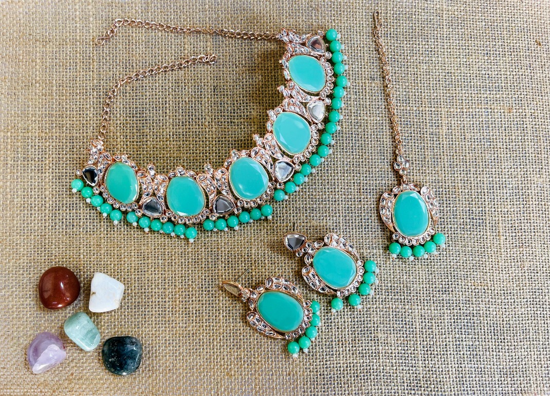 Product Details: 1 Necklace::1 Pair of Earring::1 Maang Tikka