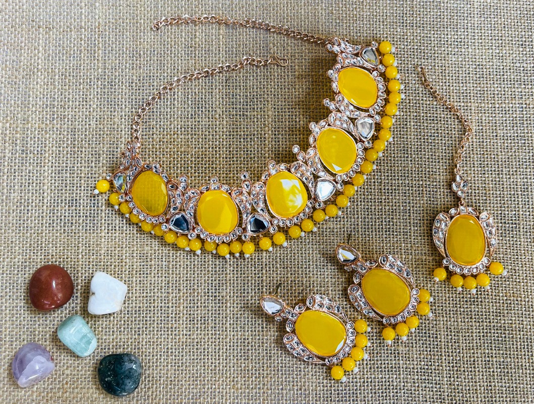 Product Details: 1 Necklace::1 Pair of Earring::1 Maang Tikka