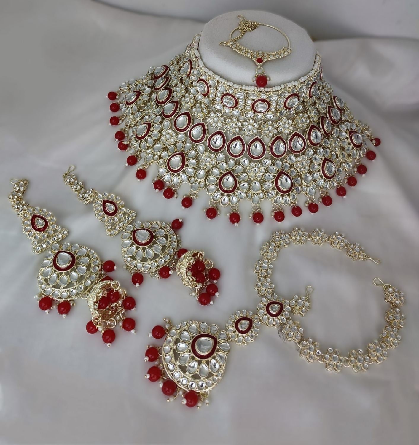 Details1 Necklace, 1 Pair Earrings, 1 Nose Ring, 1 Mang Patti With Mang Tikka