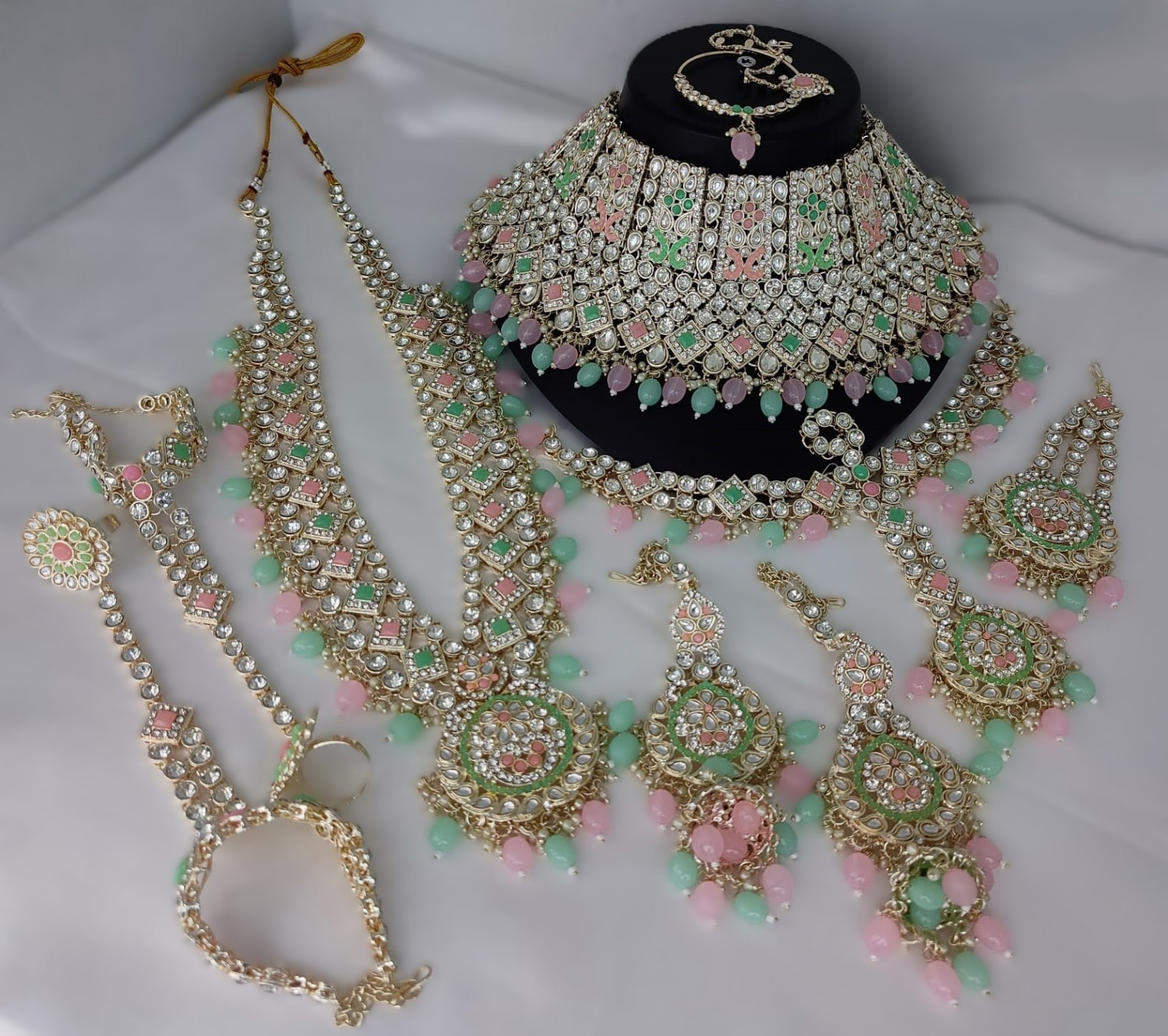 Details1 Choker Necklace, 1 Long Necklace, 1 Pair Earrings, 1 Nose Ring, 1 Mang Patti With Mang Tikka, 1 Passa, 1 Pair Of Hathpaan