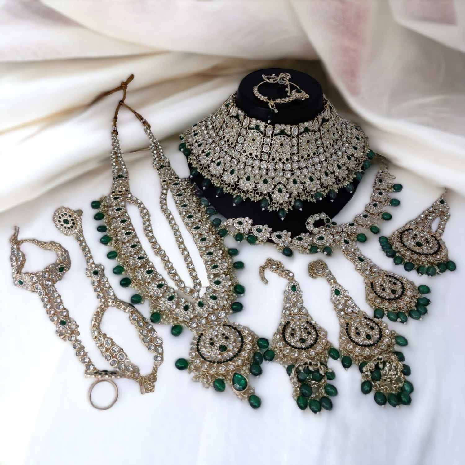 Details1 Choker Necklace, 1 Long Necklace, 1 Pair Earrings, 1 Nose Ring, 1 Mang Patti With Mang Tikka, 1 Passa, 1 Pair Of Hathpaan
