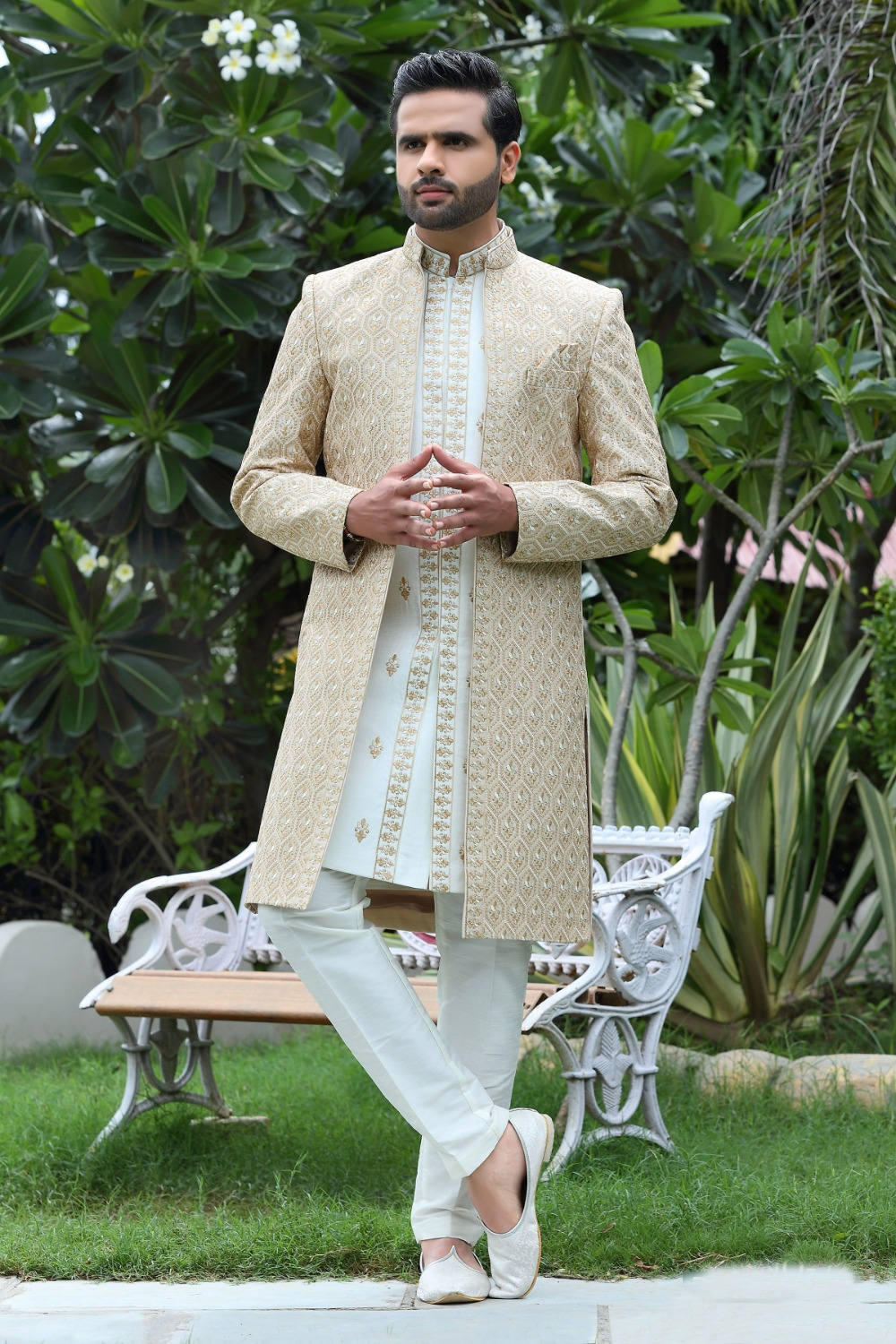 Sightly Soft Art Silk Off White & Cream Wedding Sherwani