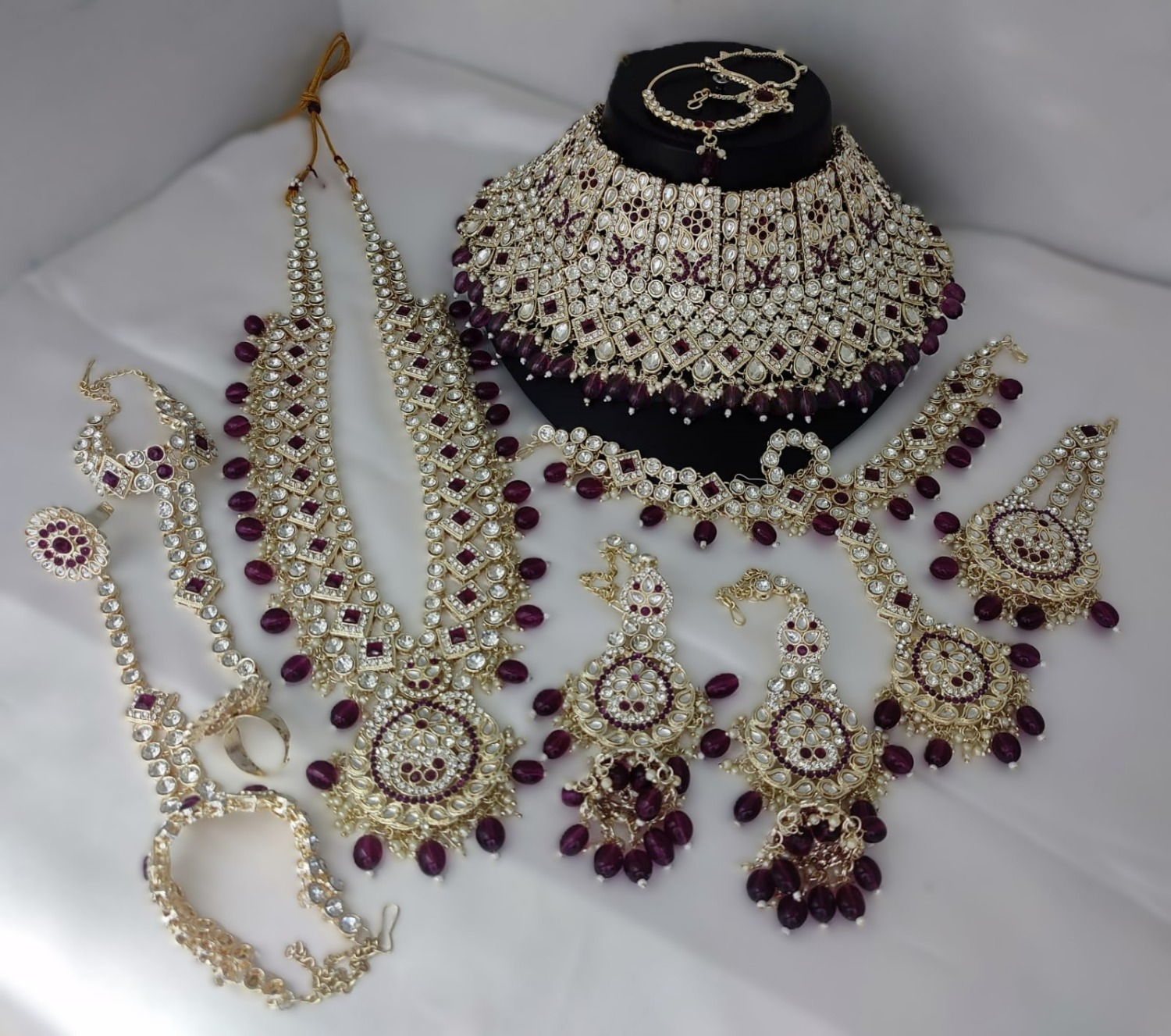 Details1 Choker Necklace, 1 Long Necklace, 1 Pair Earrings, 1 Nose Ring, 1 Mang Patti With Mang Tikka, 1 Passa, 1 Pair Of Hathpaan