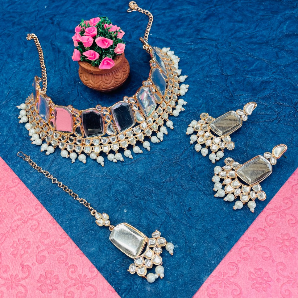Product Details: 1 Necklace::1 Pair of Earring::1 Maang Tikka
