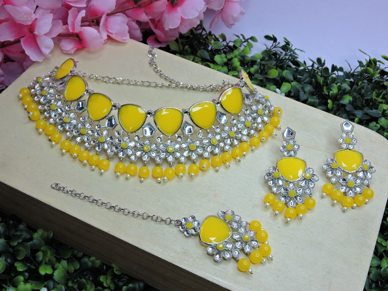 Product Details: 1 Necklace::1 Pair of Earring::1 Maang Tikka
