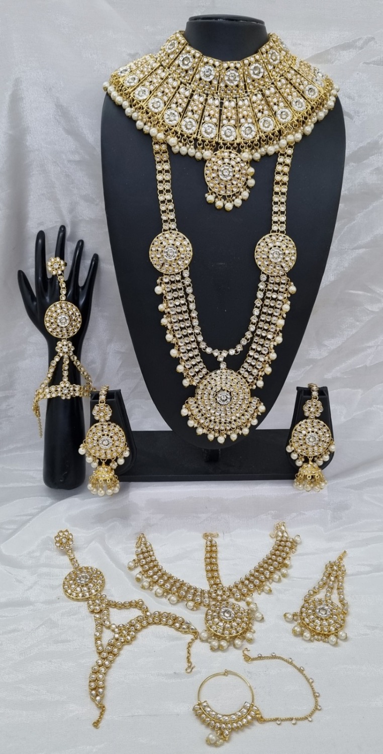 Details1 Long Set, 1 Choker Set, 2 Earrings, 2 Bracelet [Hath Patti], 1 Nath [Nose Ring], 1 Sheesh Patti [Matha Patti/Head Band], 1 Tikka [Passa]