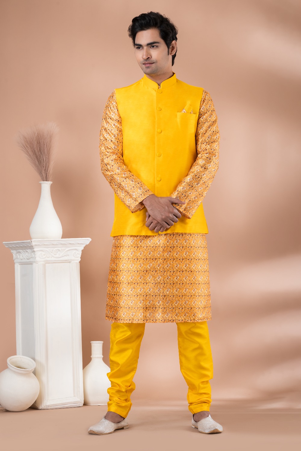 Sublime Banarasi Silk Yellow Kurta Pajama With Jacket