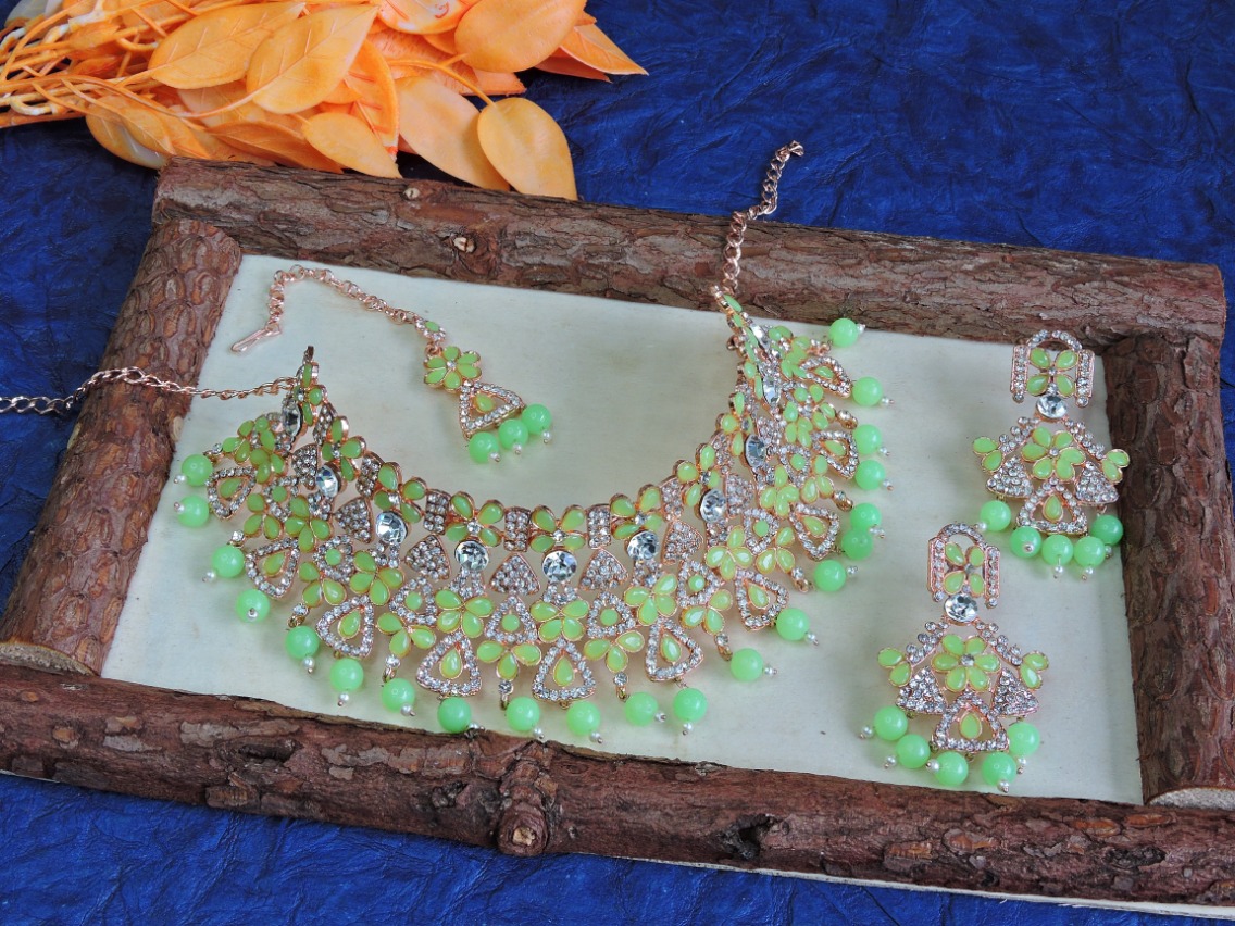 Product Details: 1 Necklace::1 Pair of Earring::1 Maang Tikka
