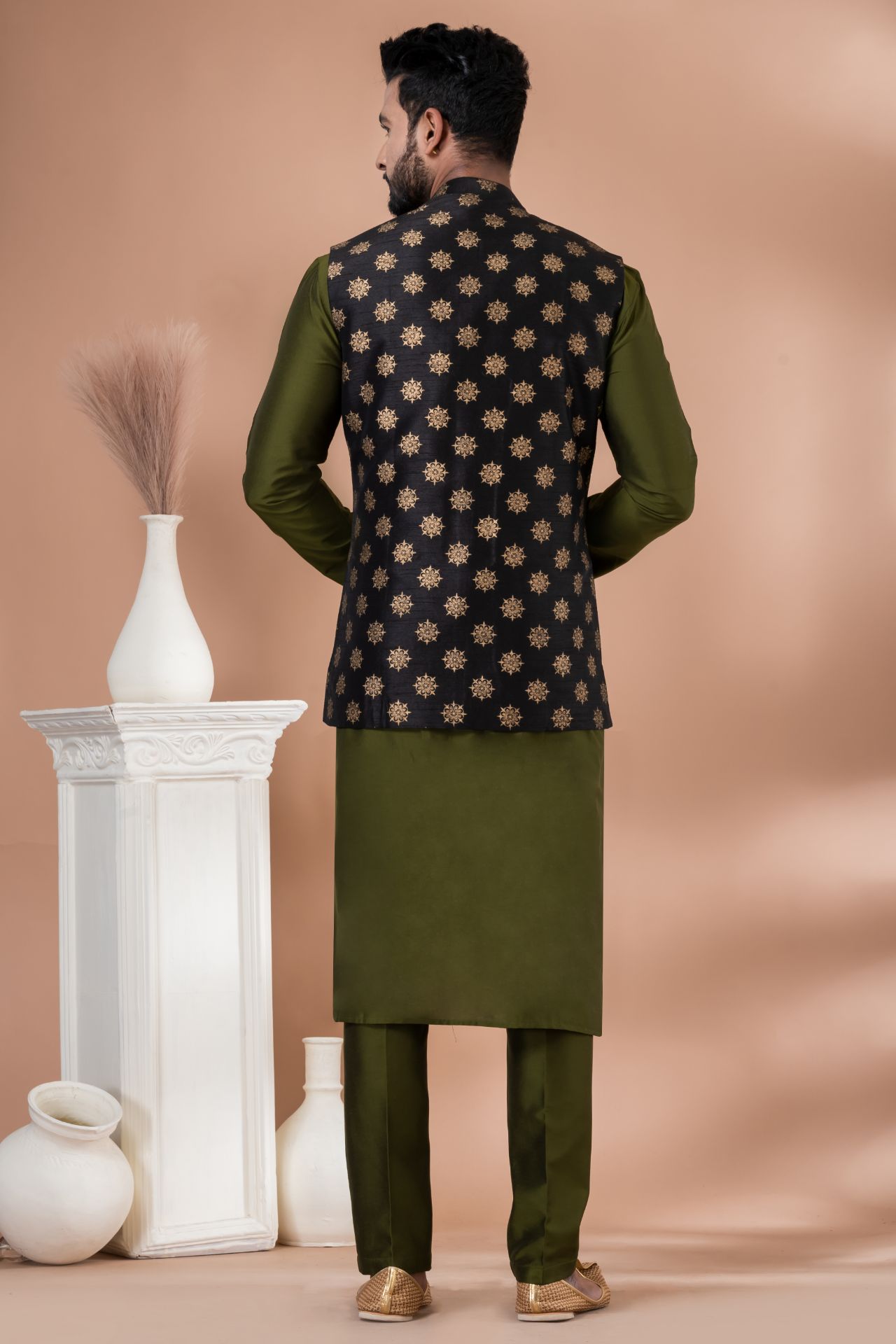 Jacket Fabric: {Dhupion Silk With Block Print}Kurta Fabric: {PS Viscose}Bottom Fabric: {PS Viscose}Jacket Color: {Black}Kurta Color: {Mehendi Green}Bottom Color: {Mehendi Green